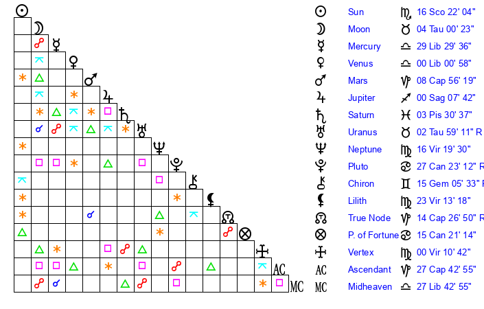 | Neptune | 16 Virgo 19 | 29 Pisces 37 | 16 Virgo 7 |