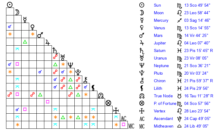 Moon | 23 Leo 56 | 13 Capricorn 41 | 14 Libra 0 |
