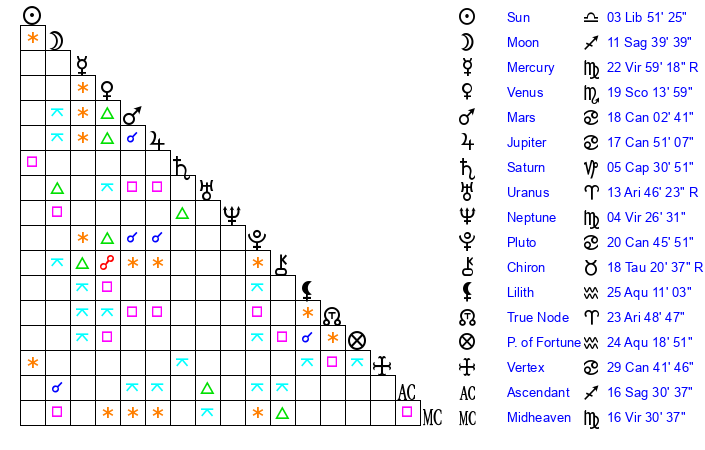 | Sun | 3 Libra 51 | 4 Libra 50 | 9 Capricorn 19 |