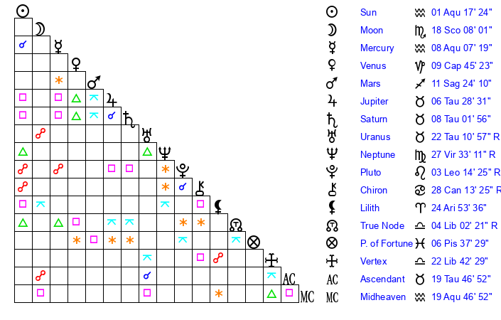 | Saturn | 8 Taurus 13 | 16 Pisces 17 | 15 Taurus 14 |