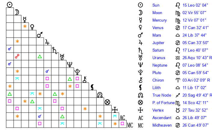 | Neptune | 7 Leo 9 | 1 Aries 51 | 9 Leo 17 |