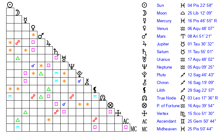 Venus | 6 Aquarius 48 | 10 Aries 4 | 7 Pisces 42 |