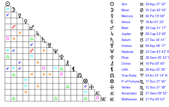 Sun | 29 Aquarius 27 | 0 Pisces 17 | 19 Gemini 10 |