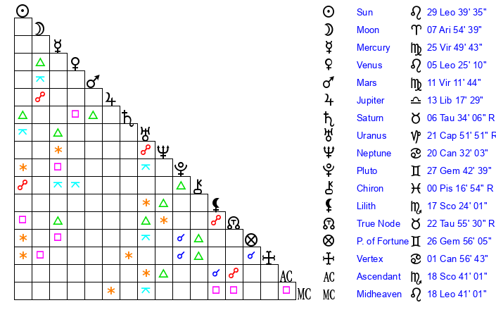 | Sun | 29 Leo 40 | 0 Virgo 49 | 23 Sagittarius 53 |