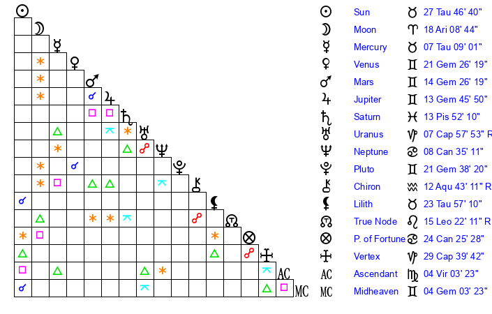 | Mars | 14 Gemini 27 | 14 Leo 40 | 2 Virgo 1 |