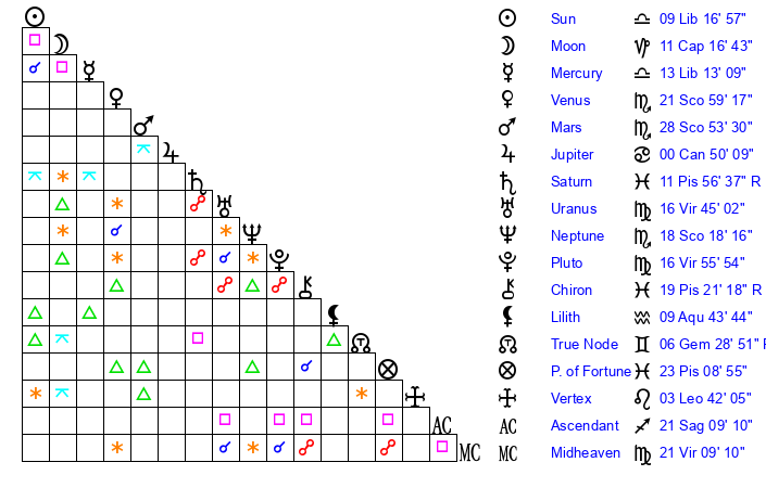 Venus | 21 Scorpio 59 | 16 Virgo 10 | 25 Capricorn 25 |