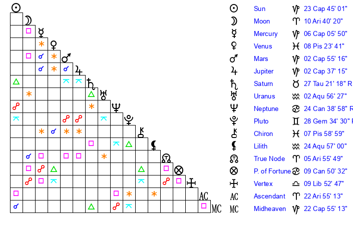 Sun | 23 Capricorn 45 | 24 Capricorn 34 | 15 Taurus 20 |