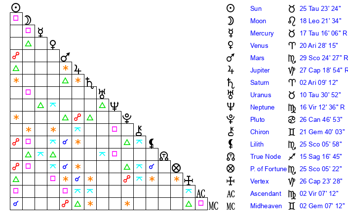 | Sun | 25 Taurus 23 | 26 Taurus 4 | 19 Leo 32 |