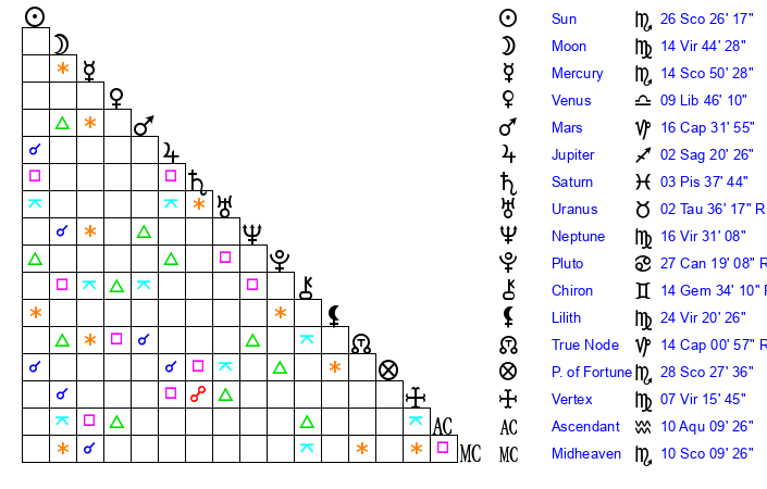 | Mercury | 14 Scorpio 51 | 29 Scorpio 13 | 3 Aquarius 1 |