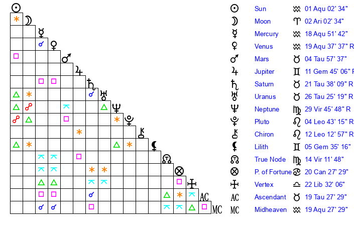 | Moon | 2 Aries 2 | 0 Scorpio 12 | 13 Aries 37 |