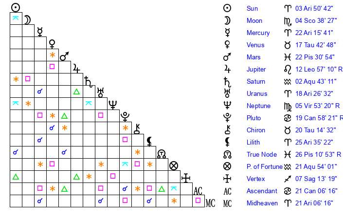 | Mercury | 22 Aries 15 | 4 Aries 31 | 18 Cancer 2 |