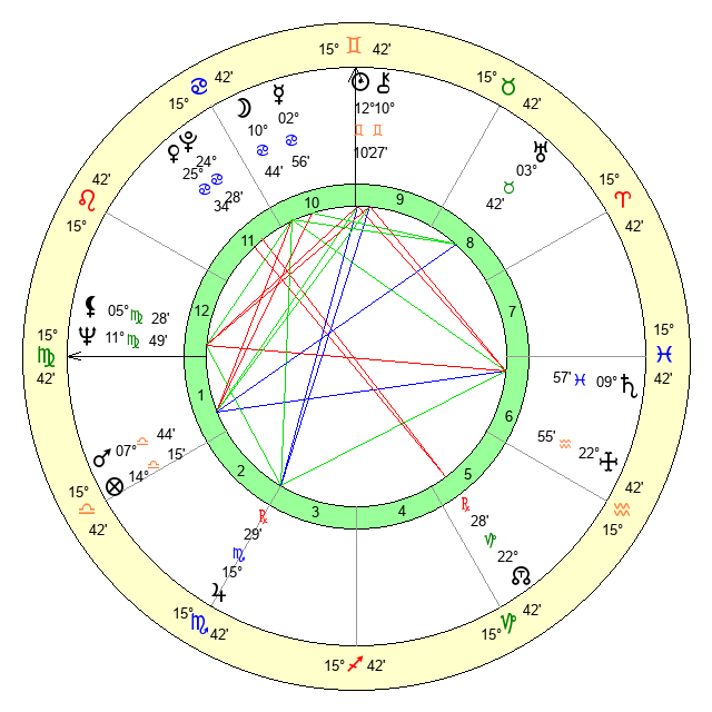 | Sun | 12 Gemini 10 | 13 Gemini 22 | 8 Virgo 19 |