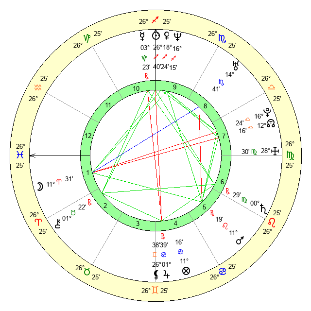 | Saturn | 0 Virgo 54 | 13 Pisces 35 | 28 Leo 33 |