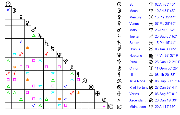 | Mars | 23 Aries 10 | 21 Cancer 7 | 26 Gemini 29 |