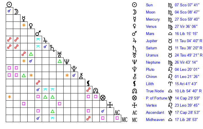 | Moon | 4 Scorpio 10 | 19 Aquarius 41 | 16 Sagittarius 11 |