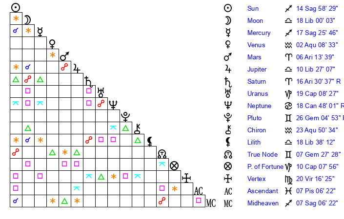 | Moon | 18 Libra 2 | 4 Pisces 6 | 25 Sagittarius 46 |