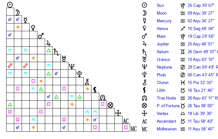| Uranus | 10 Aquarius 41 | 23 Taurus 21 | 15 Aquarius 32 |