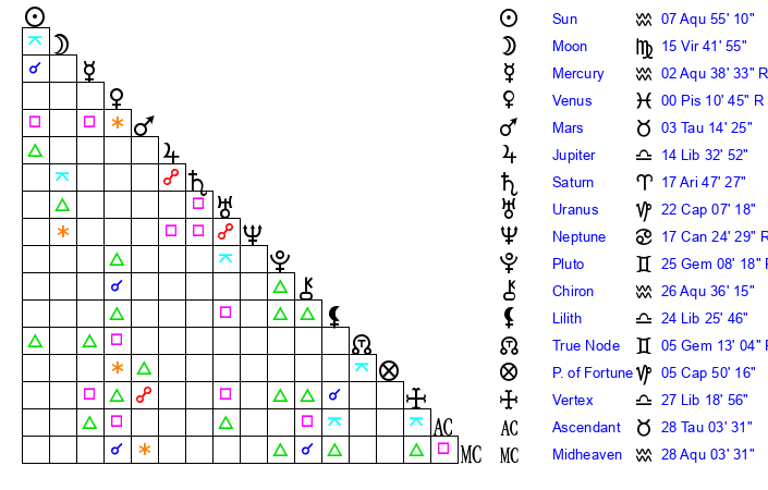 | Sun | 7 Aquarius 55 | 9 Aquarius 2 | 1 Gemini 40 |