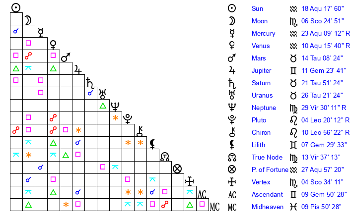 | Sun | 18 Aquarius 18 | 19 Aquarius 10 | 10 Taurus 41 |