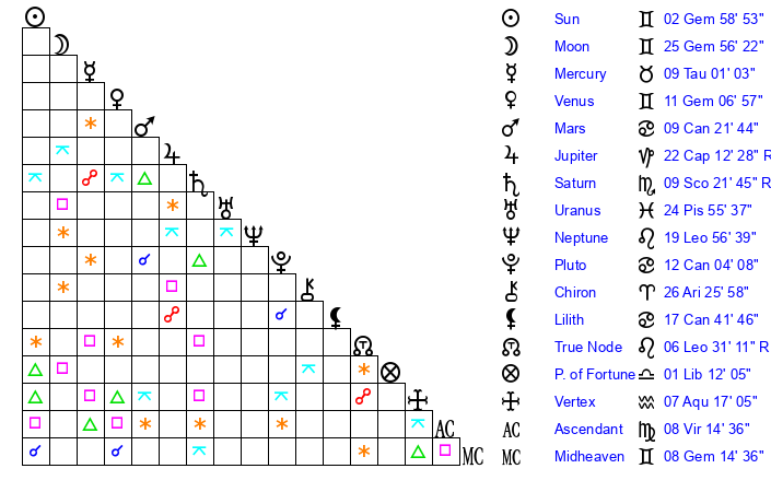 | Moon | 25 Gemini 52 | 29 Aries 41 | 23 Aquarius 10 |