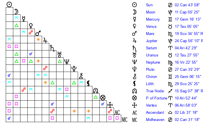| Pluto | 27 Cancer 35 | 3 Aquarius 15 | 29 Cancer 46 |