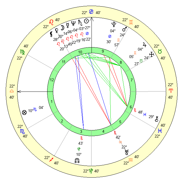 | Sun | 27 Cancer 22 | 28 Cancer 14 | 12 Scorpio 43 |