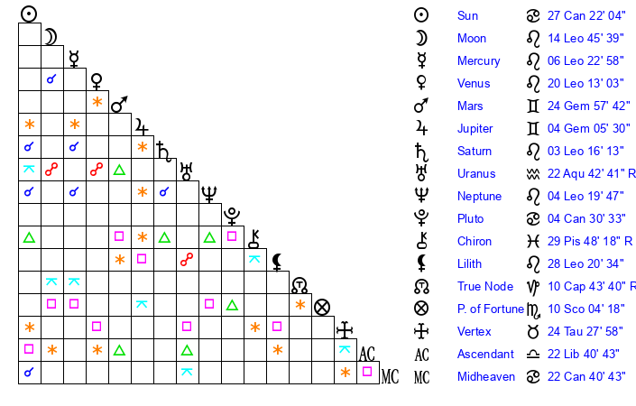 | Neptune | 4 Leo 20 | 2 Aries 6 | 7 Leo 6 |