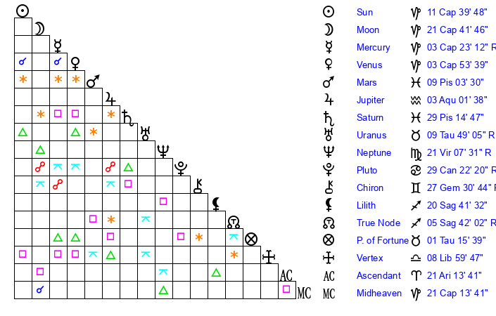 | Sun | 11 Capricorn 39 | 12 Capricorn 18 | 10 Aries 19 |