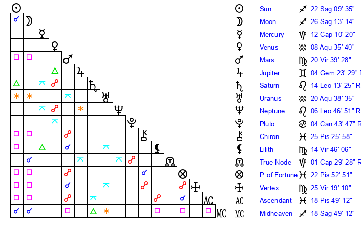 | Moon | 26 Sagittarius 12 | 14 Gemini 22 | 24 Scorpio 59 |