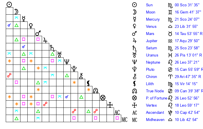 | Sun | 0 Scorpio 32 | 1 Scorpio 32 | 10 Aquarius 50 |