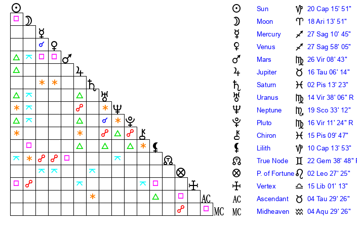 Pluto | 16 Virgo 12 | 1 Aquarius 22 | 14 Virgo 52 |