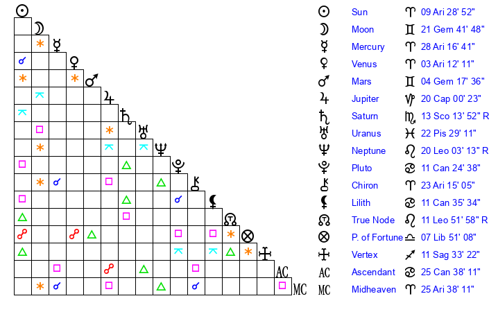 | Moon | 21 Gemini 42 | 27 Aries 55 | 21 Aquarius 17 |