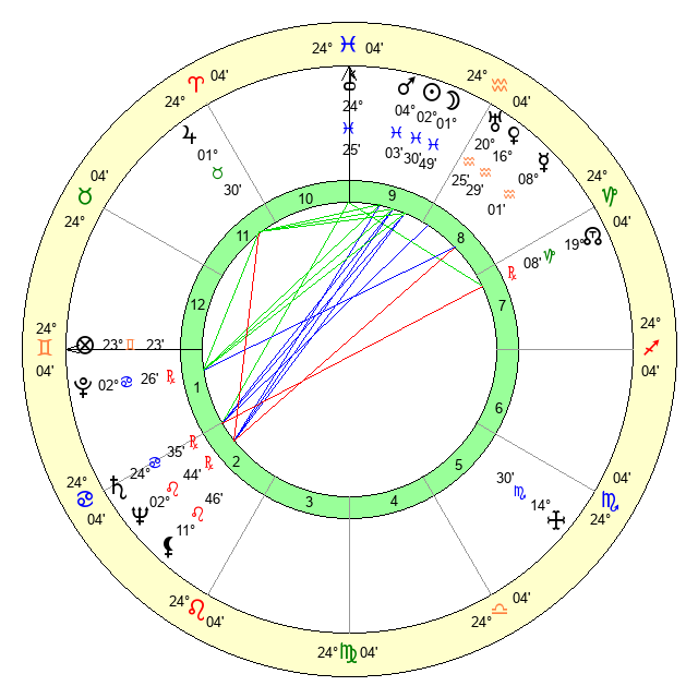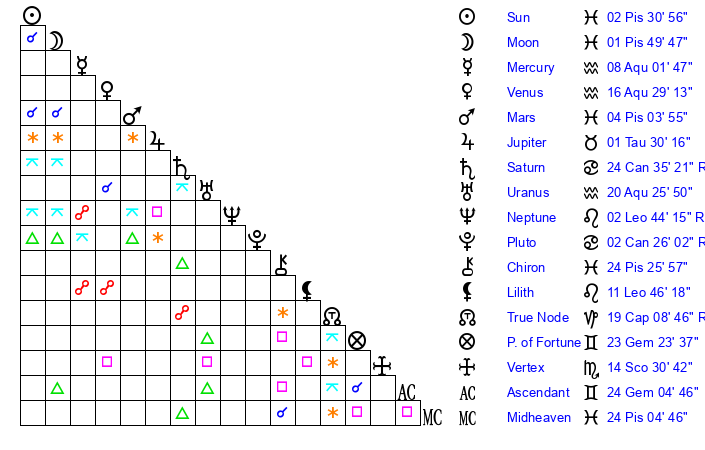 | Sun | 2 Pisces 31 | 3 Pisces 19 | 18 Gemini 15 |
