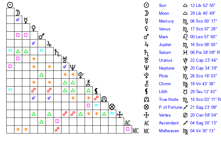 Sun | 12 Libra 53 | 13 Libra 36 | 12 Scorpio 43 |