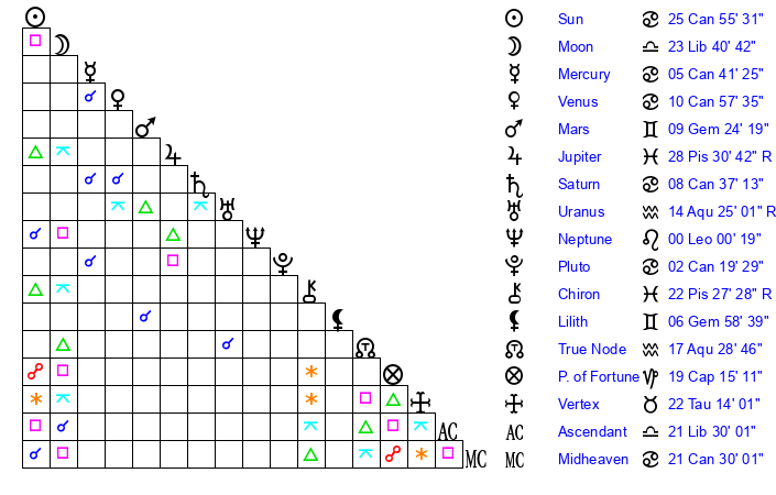 | Sun | 25 Cancer 55 | 27 Cancer 16 | 13 Scorpio 12 |