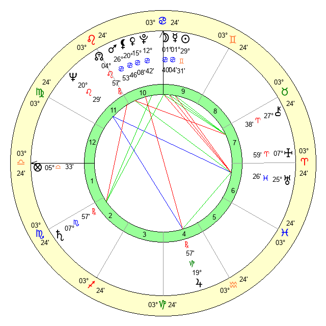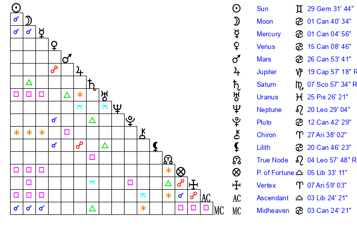 | Sun | 29 Gemini 32 | 0 Cancer 20 | 5 Libra 47 |