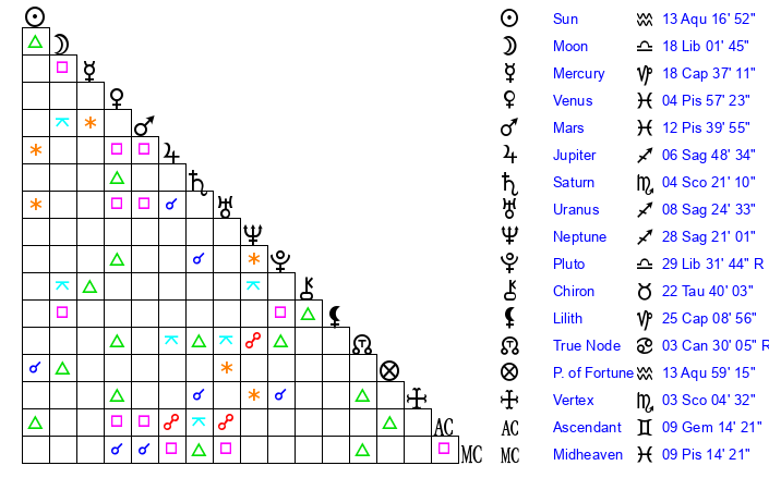 | Sun | 13 Aquarius 17 | 14 Aquarius 6 | 25 Pisces 32 |