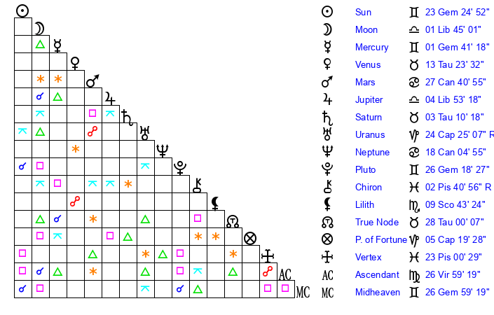 | Sun | 23 Gemini 25 | 24 Gemini 34 | 14 Libra 15 |