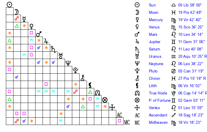 | Neptune | 6 Leo 39 | 0 Aries 34 | 6 Leo 1 |