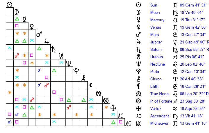 | Sun | 9 Gemini 42 | 10 Gemini 29 | 15 Virgo 30 |