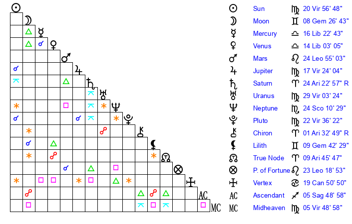 Sun | 20 Virgo 57 | 21 Virgo 9 | 17 Scorpio 22 |