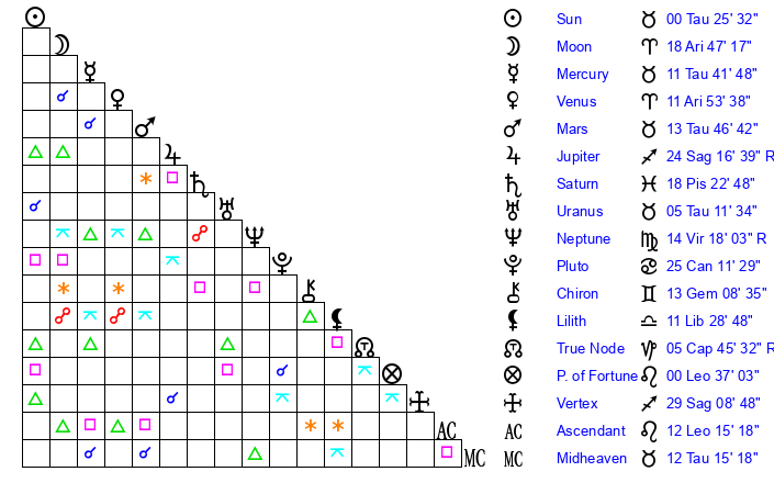 | Venus | 11 Aries 53 | 25 Pisces 45 | 1 Leo 11 |