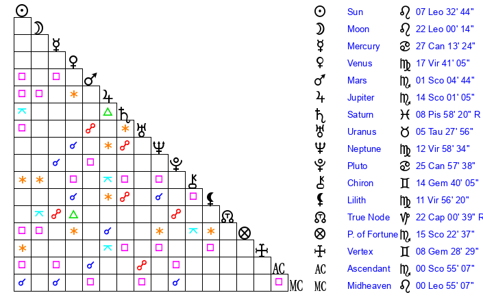 | Sun | 7 Leo 32 | 8 Leo 44 | 5 Scorpio 20 |