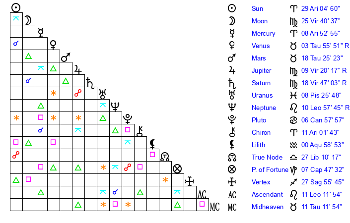 | Saturn | 19 Virgo 32 | 26 Pisces 34 | 22 Virgo 42 |