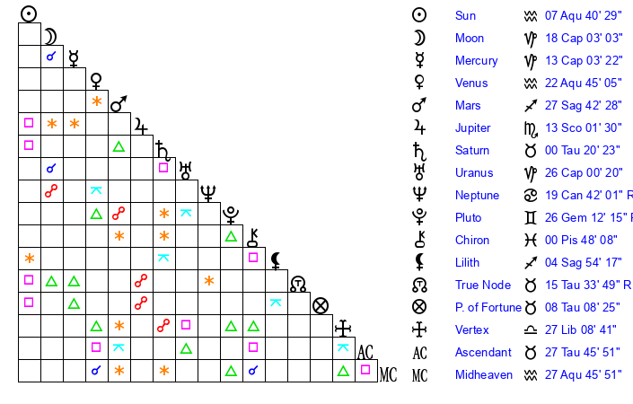 Sun | 7 Aquarius 41 | 9 Aquarius 2 | 0 Gemini 28 |