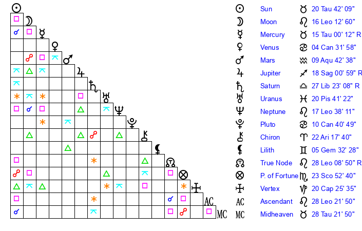 | Moon | 16 Leo 7 | 10 Scorpio 19 | 8 Taurus 53 |