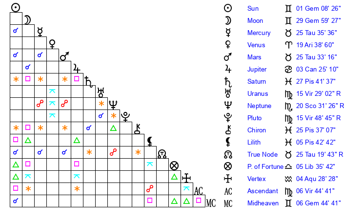 Venus | 19 Aries 39 | 16 Aries 20 | 28 Gemini 48 |