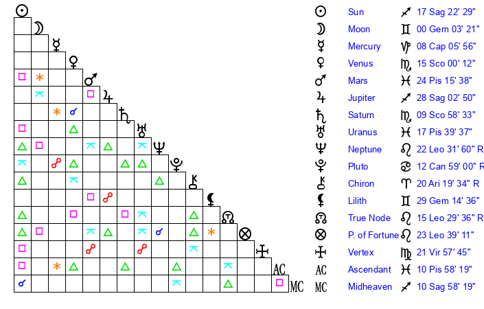 | Jupiter | 27 Sagittarius 53 | 15 Gemini 59 | 18 Capricorn 25 |