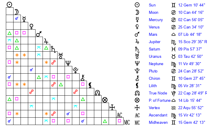 | Sun | 12 Gemini 10 | 13 Gemini 22 | 8 Virgo 19 |