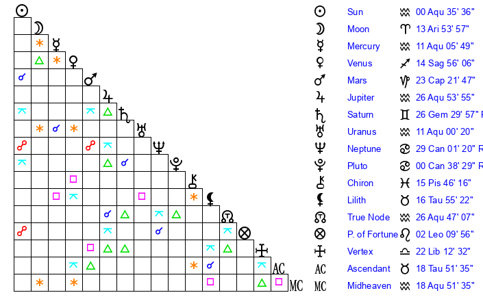 | Sun | 0 Aquarius 35 | 1 Aquarius 54 | 19 Taurus 54 |